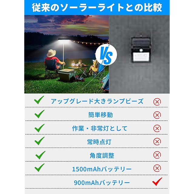 【省エネ・電気代不要・停電対応】弊社のセンサーライトはソーラー充電なので、昼間に自動充電し、夜に自動充電します。エネルギー転換率は20%UP、電気代不要だけではなく、二酸化炭素の排出量もゼロであるエネルギーで環境に優しいです。完璧な停電対策、地震や台風などの災害で万一電源が停止しても照明機能を保ち、防犯や避難などに貢献します。
