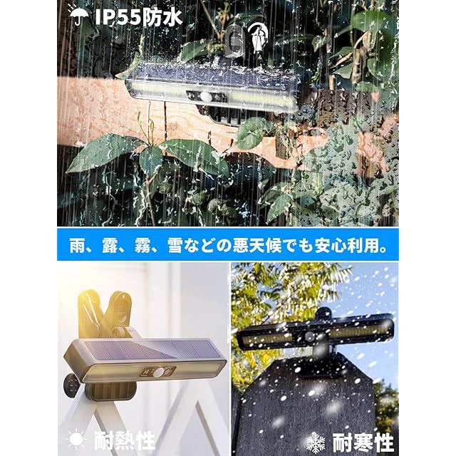 【IP55防水】屋外 センサーライトの防水レベルはIP55なので、雨・雪・霧などの日でも安心してお使いいただけます。耐久性のあるABS材質を採用しているので、耐熱・耐凍性が優れています。雪などの悪天候てもご心配になりません。