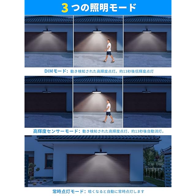 【3つ点灯モード】じんかんせんさー ライト 屋外は高輝度センサーモード、DIMモード、常時ライトモード3つの知能点灯モードが搭載されます。★スイッチを一回目押すると「DIMモード」:夜に動き検知された高輝度点灯、約13秒後低輝度点灯します。★二回目スイッチを押しすると「高輝度センサーモード」になる:夜や暗くなると、動き検知された高輝度点灯、約13秒後自動消灯します。★三回目スイッチを押しすると「常時点灯モード」になる:暗くなると自動に常時点灯します。
