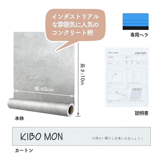 壁紙 コンクリート 壁紙シール コンクリート壁紙 ライトグレー 打ちっぱなし リメイクシート コンクリート調 剥がせる壁紙 はがせる 幅60cmx10m KIBO MON 初心者・女性一人でもOK ツヤなし 模様替え 防水防汚 DIY 賃貸OK | つむぎ屋