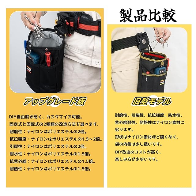 素材のアップグレード:本製品の腰袋は1680Dナイロン素材を使用しており、標準モデルに採用されているポリエステル素材と比較して、耐摩耗性・耐引裂性・耐久性に優れています。長期間の使用でも破損しにくく、大工や電気工事士などプロフェッショナルの過酷な作業環境にも最適です