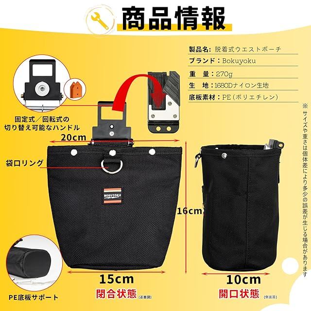 簡単に着脱可能:本着脱式腰袋は、ワンタッチ着脱式の工具ホルダー用回転式オス金具(※工具ホルダーは付属しておりません)が装備されており、ベルトに簡単に取り付け・取り外しが可能です。余分な工具は不要で、作業時の負担を軽減し、腰への負荷を抑えて快適性を向上させます。さまざまな作業ニーズに柔軟に対応できる設計です