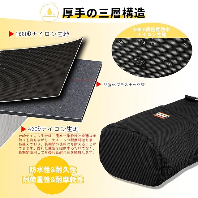 高い耐久性:作業工具バックは、1680D高密度オックスフォード布素材を採用し、優れた耐摩耗性を誇ります。防水・防汚加工が施され、破れにくく、長期間使用しても劣化しにくいため、日常の過酷な作業に最適です