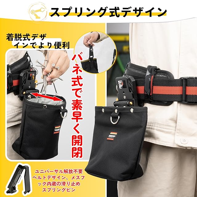 簡単に着脱可能:工具入れポーチには着脱式工具ホルダーが付いており、ベルトに簡単に取り付け・取り外しが可能です。余計な道具を使うことなく、腰の負担を軽減し、快適さを向上させる設計です