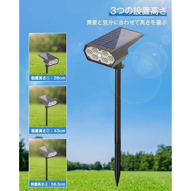 【高感度センサー搭載・3つの設置高さ】ソーラー ガーデンライトは高輝度LED42個搭载で強力照射し、人感センサーの感知角度が140°で、8~10メートル検知距離で照明効果が抜群です。5つの接続管を組み合わせて高さを変えますと、これにより、モーションセンサー機能がより感度が高くなります。このセンサーライト 屋外は3つの設置高があり、需要と気分に合わせて高さを選びます。設置高さ①:26cm、設置高さ②:43cm、設置高さ③:58.5cm。