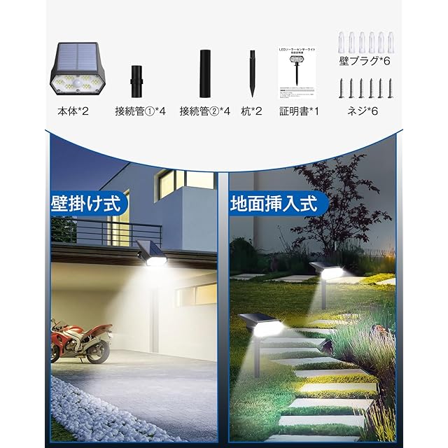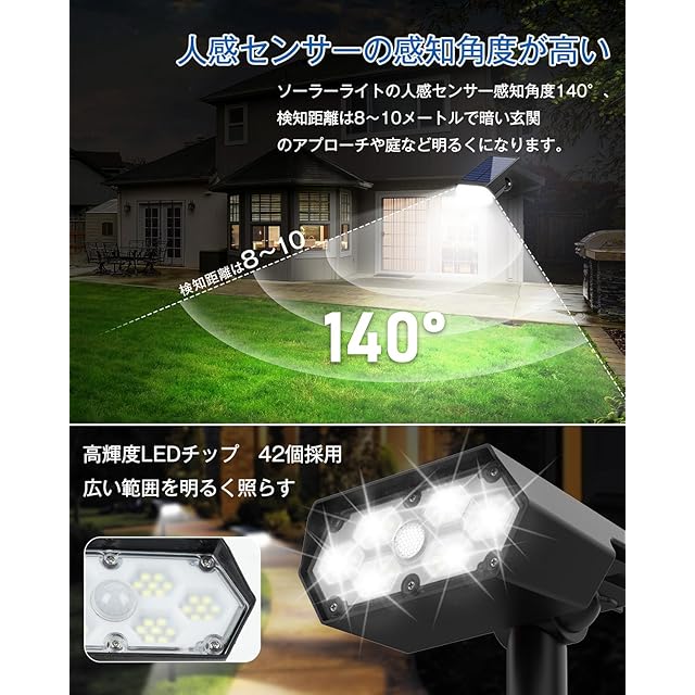 商品名:センサーライト 屋外 防水 人感センサー ソーラー スポット ガーデンライト 自動点灯 防犯 昼光色 42LEDs 高輝度 2200mAh大容量バッテリー IP65防水 ガーデン 玄関 庭園 車道 歩道 駐車場 屋外 照明 2個セット