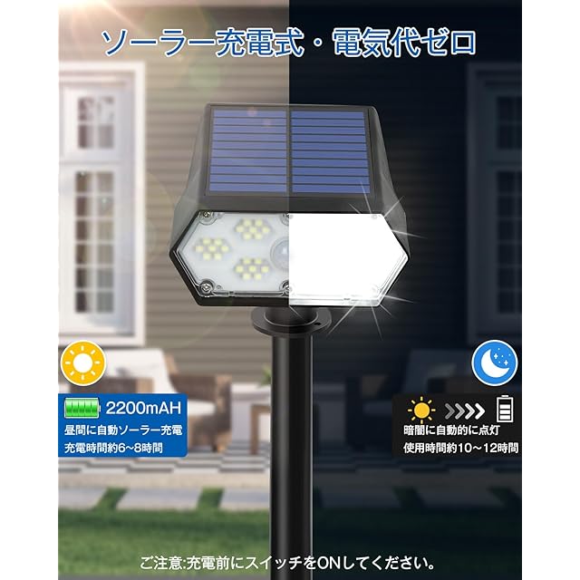 【22%転换率・2200mAh大容量】当社のソーラースポットライトは、高効率の単結晶シリコン技術を採用しており、配線と給電不要です!ソーラーバネルの面積より大きく設計により、エネルギー変換効率が向上するだけで転换率は22%に達します。2200mAh大容量バッテリーで、照明持続時間は大幅に向上しました!昼間に自動ソーラー充電時間約6~8時間、暗闇に自動的に点灯の使用時間約10~12時間になります。【ご注意:充電前にスイッチをONしてください。】