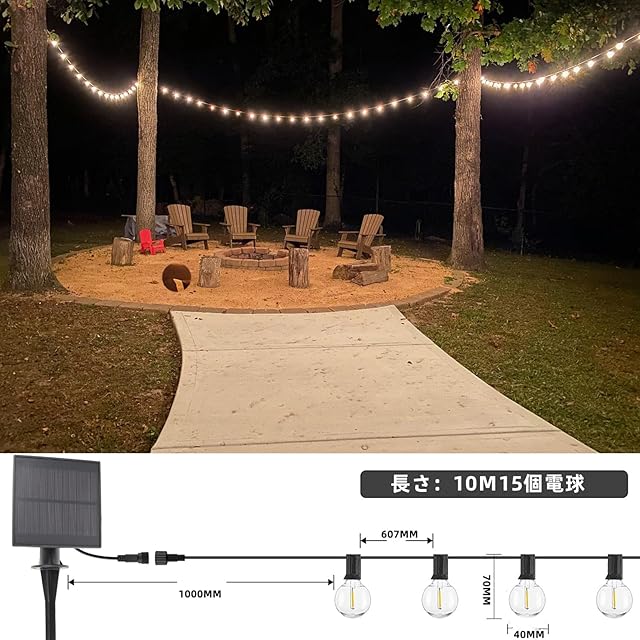 防雨型ソーラーLEDストリングライト 10M 15個LED電球付き E12口金 2700K電球色 PC素材 破損しにくい LEDイルミネーションライト 屋内/屋外照明 ガーデンライト クリスマス イルミネーション 装飾ライト誕生日パーティー電飾 結婚式飾り