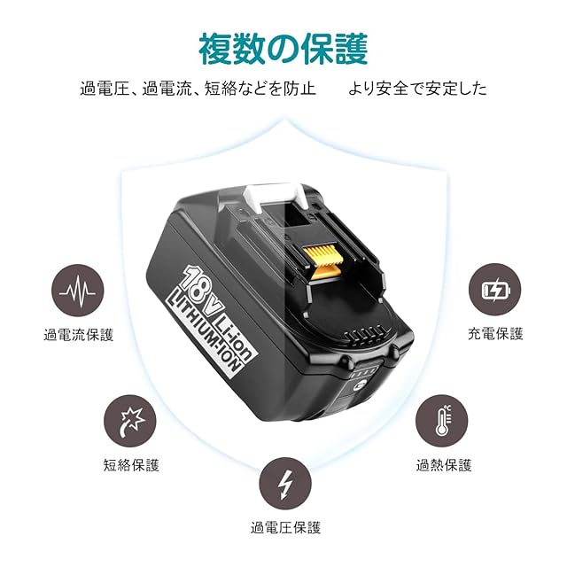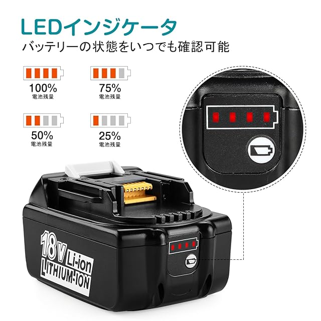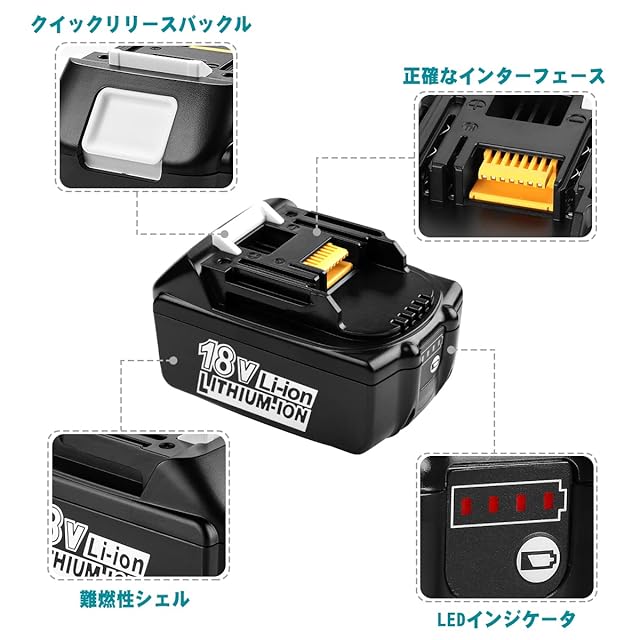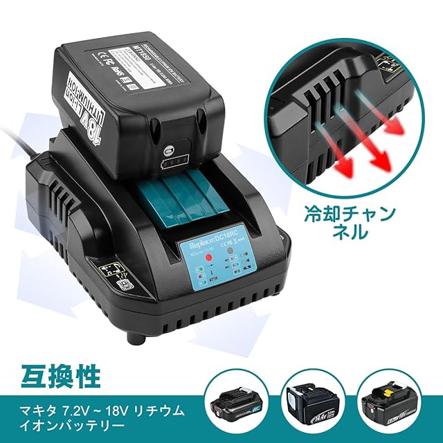 マキタ バッテリー BL1830、BL1840、BL1850、 BL1860、BL1430B、BL1460B、BL1830B、 BL1850B、BL1860B、BL1890 など。マキタ充電器 DC18RA、DC18RB、DC18RC、DC18RD、DC18SF、DC18SE、DC18SD、DC24RCと互換できます。