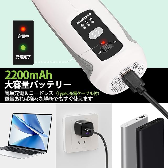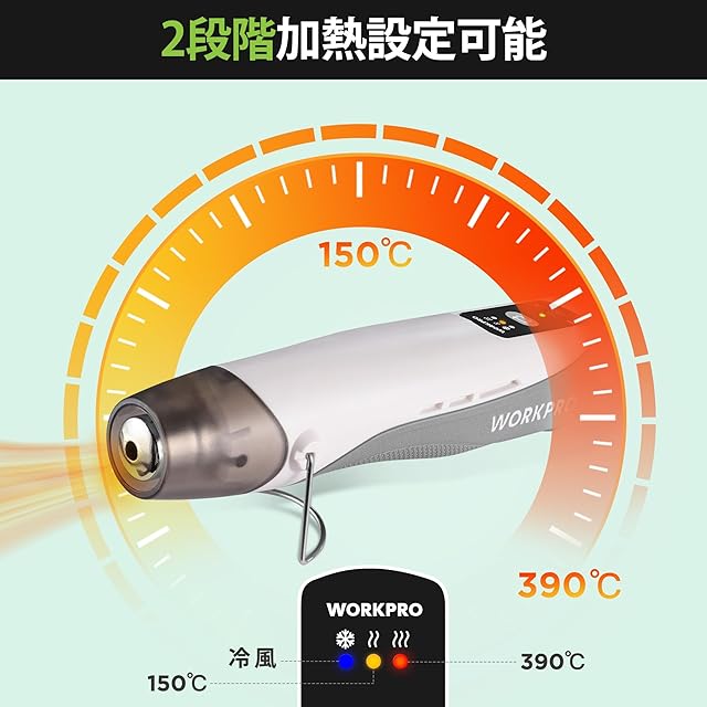 WORKPRO ヒートガン コードレス ホットガン 7.2V【加温新進化 】 小型タイプ ミニヒートガン USB充電式 150℃-390℃急速加温 2段階加熱可能 充電ライト付 過負荷保護 レジン気泡とり ステッカー剥がし 接合 補修 熱処理 乾燥 粘着 エンボス DIY 手芸用 熱工具