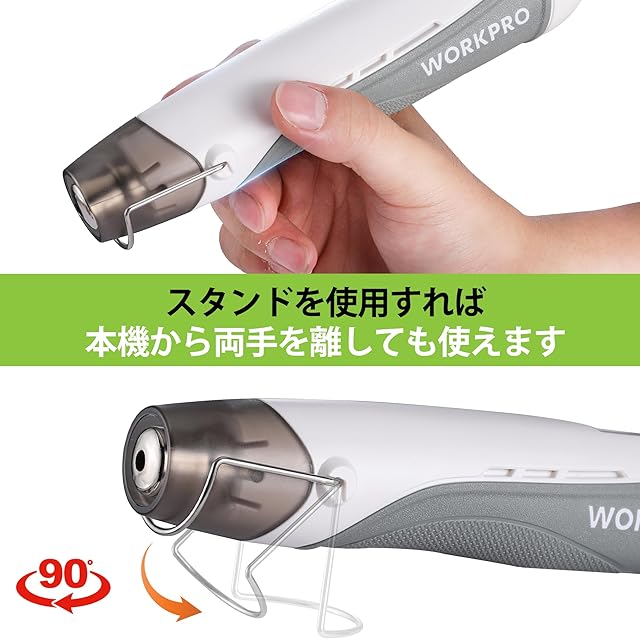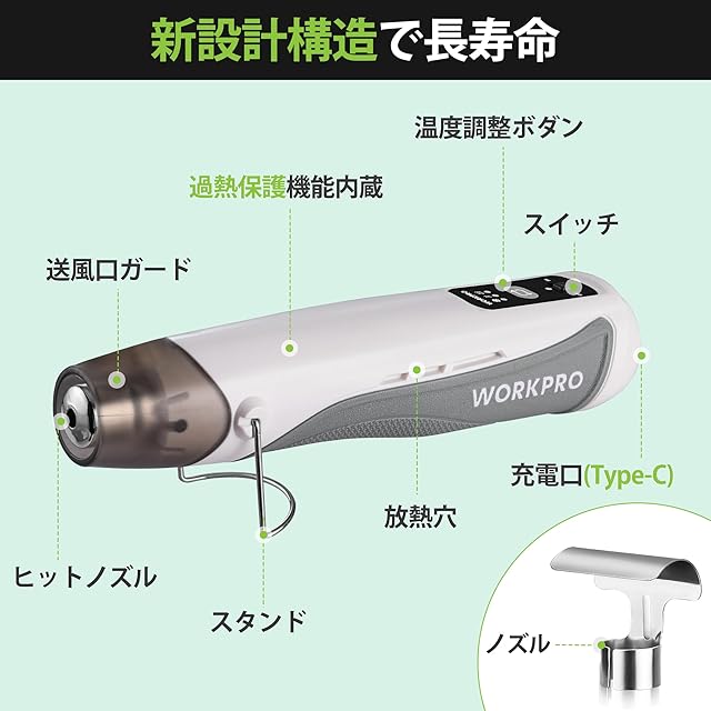 WORKPRO ヒートガン 【コードレス】 ホットガン 7.2V 小型タイプ ミニヒートガン USB充電式 150℃-390℃急速加温 2段階加熱可能 充電ライト付 過負荷保護 レジン気泡とり ステッカー剥がし 接合 補修 熱処理 乾燥 粘着 エンボス DIY 手芸用 熱工具 | つむぎ屋