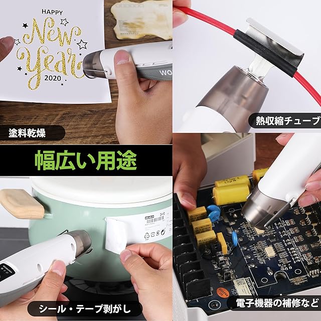 【急速加熱 】高品質のセラミック発熱コアにより、30秒以内に150℃まで一気に上昇。短時間で作業効率を大幅にアップします。特にDIYや精密な作業に適しており、迅速な熱処理が可能です。熱収縮チューブの加熱、ケーブルの溶接、パテの乾燥、塗装やシールの剥がし作業、収縮性フィルム、エンボスパウダーなど様々な使い道があります。