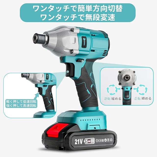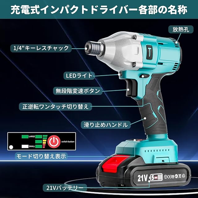 商品名:【2025新型】電動インパクトドライバー 21V 充電式 ブラシレスモーター【2000mAh バッテリー*2個】最大トルク300N.m 無段変速 正逆切替 自動停止モード LEDライト付き DIY 過負荷保護 過熱保護 家具の組立て
