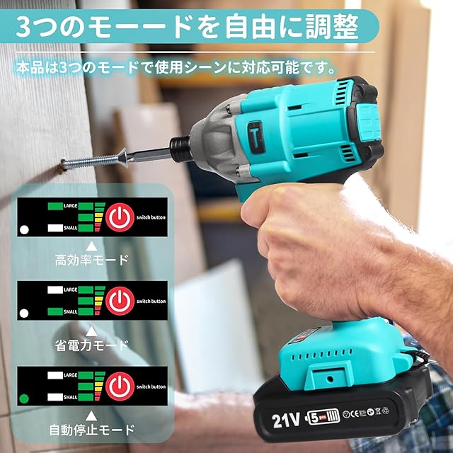 【正逆転両用&無段変速&モード切り替え】インパクトドライバーの両側には、正回転スイッチと逆回転スイッチがあります。正回転でネジを締め、逆回転で取り外し、必要に応じてスイッチを押し、ビットの回転方向を切り替えます。逆回転時、電源ボタンを押すと「small」ランプが点灯し、自動停止機能が作動することができます。無断変速がついており、本体のトリガーを握る力の強弱で無段階回転数調整が可能です。充電式インパクトドライバーのモード切替ボタンを押すだけで、自動停止モード、高効率モード、省電力モードの選択ができます。