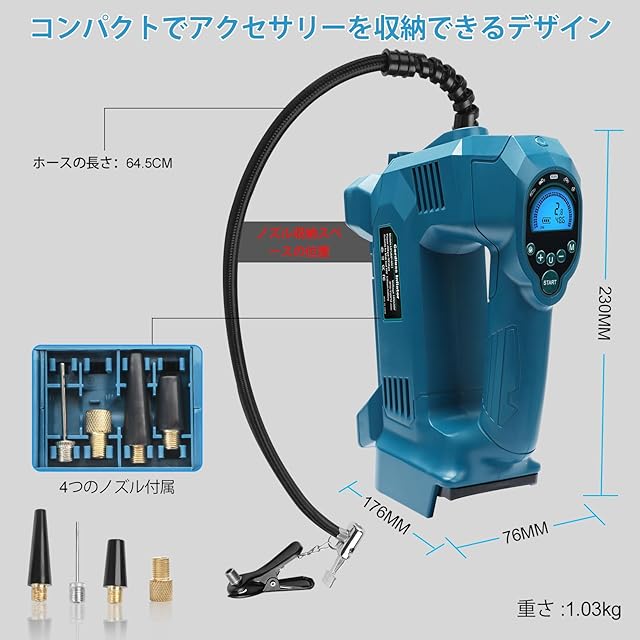 商品名:Waitley ウェイトレイエアコンプレッサー 空気入れ 電動空気入れ 自動車用 160PSI 1034kpa マキタ互換 18v 車用エアポンプ 車/バイク/自転車/浮き輪用 仏/英/米式バルブ対応 快速充填 LED照明ライト付き LCDデジタル表示 四つのノズル付き 自動停止機能 安定した台座 エアポンプ モバイルコンプレッサー (本体のみ、バッテリー別売り)