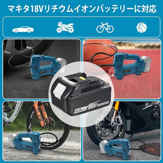 【マキタ18Vバッテリー対応・コードレス便利】 この電動空気入れはコードレス設計で、マキタ18Vバッテリーに対応。電源コードを気にせず、どこでも自由に使用できます。電源のない場所や緊急時でも、簡単にタイヤの空気を補充できるため、アウトドアや旅行にも最適です。
