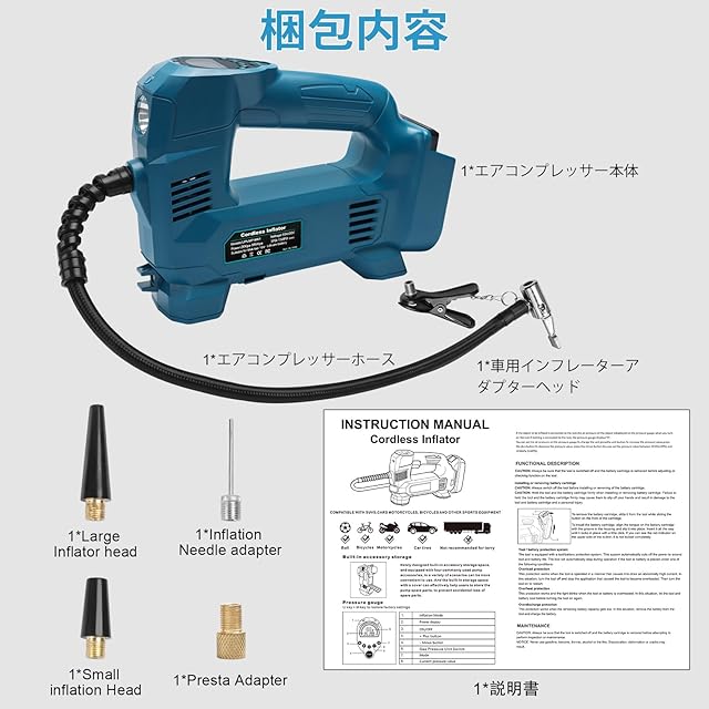 梱包内容:1*エアコンプレッサーホース、1*車用インフレーターアダプターヘッド、1*エアコンプレッサー本体、1*説明書 ご注意:ご使用前に、画面上の保護フィルムを剥がしてください。バッテリーは別売りです