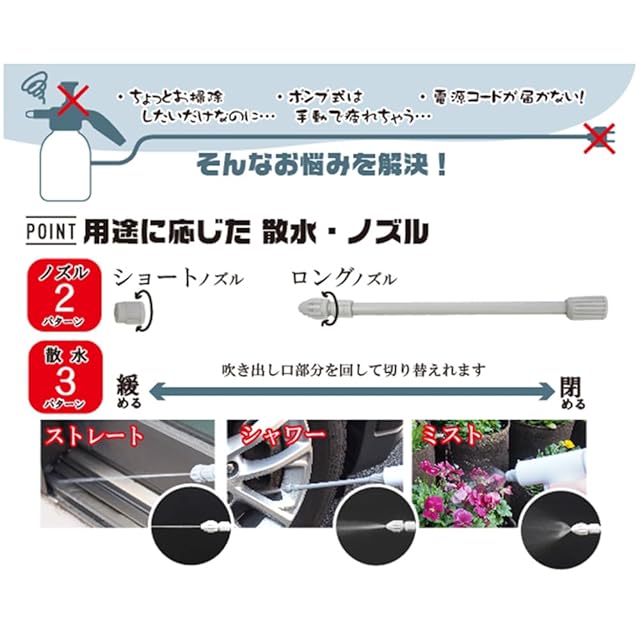 ノズルはショートノズル、ロングノズルの2種類。散水はストレート、シャワー、ミストと散水パターンが調整できます