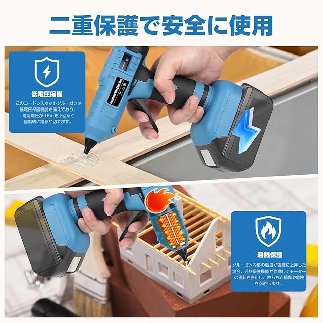 【多重安全保護】本コードレスホットグルーガンには、電圧が15V未満になると自動で電源がオフになる低電圧保護機能を搭載。さらに、内部温度を監視し、過熱時にはモーターを停止する過熱保護機能も備えています。また、PA6+30%GF素材の断熱ケースが火傷を防ぎ、安全にご使用いただけます。