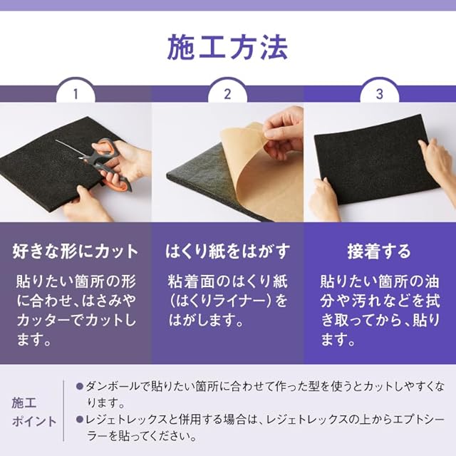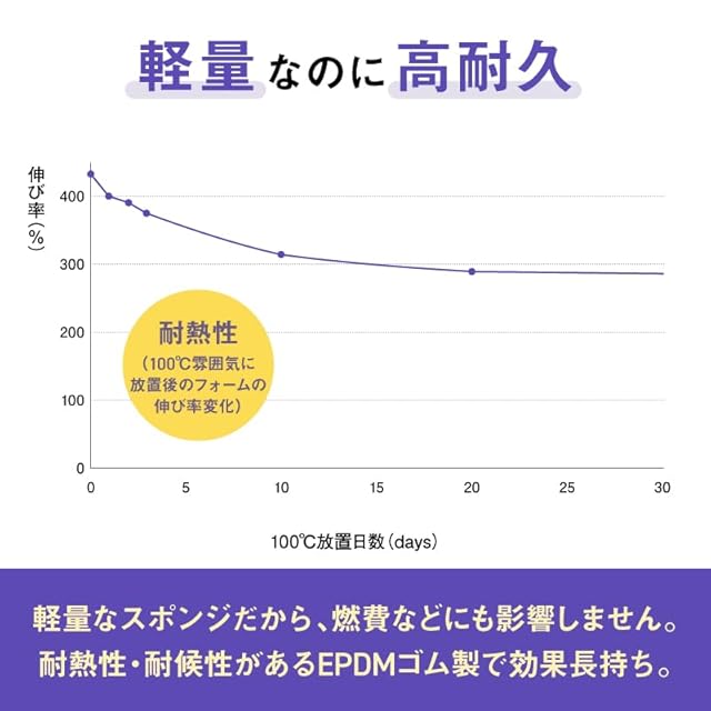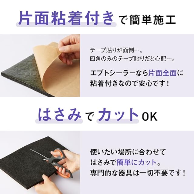 音・熱・水をシャットアウト。車のドアやルーフ、スピーカー周りに施工することでいやな雑音を軽減します。片面全面粘着付で面倒なテープ貼不要。使いたい場所に合わせてはさみで簡単カット。専門的な器具は一切不要です。軽量なスポンジのため燃費にも影響せず、耐熱性・耐候性のあるEPDMゴム製で効果長持ち。