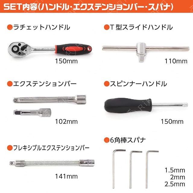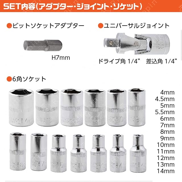 【セット内容】【ラチェット本体】1/4 (長さ155mm)【ソケットボックス】13ヶ【ソケットタイプ :+ドライバー】6本【ソケットタイプ :-ドライバー】3本【ソケットタイプ:六角】6ヶ【ソケットタイプ:トルクスレンチ型】6ヶ【六角レンチ:Lタイプ】3本【スライドT型レンチ 1/4】1ヶ【ユニバーサルジョイント】1ヶ(40mm)【変換用ビットアダプター】1ヶ(1/4,六角)【エクステンションバー】2本(大、小)【スプリングタイプ】1本 (145mm)【収納ケースサイズ】長さ24cm 幅13cm 厚み4cm 約 重量1.25kg