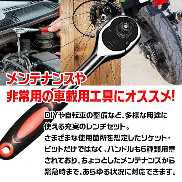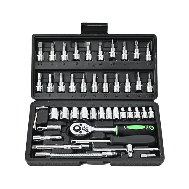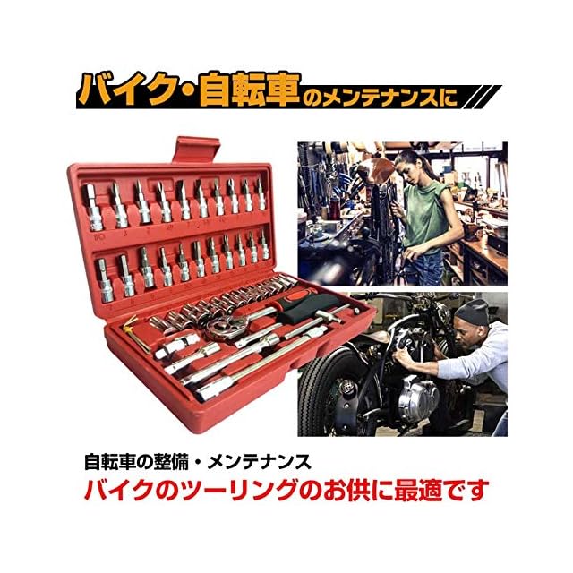 【お得なソケットレンチセット】車、バイク、自転車などの整備,他のどんな作業にも汎用的にご使用頂けます。・小さくコンパクトなケースに46セットのアイテムが収納されており、持ち運びやすく収納も楽に出来ます。・ソケット類が豊富でジョイントなども充実してますので作業がはかどります。