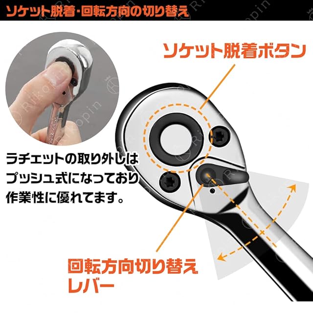 【特徴】ソケット差込角:6.3mm(1/4”)、ラチェットハンドルはクイックリリースのデザインで、ソケットの脱着はボタンを押すだけで簡単にできる。今まで以上に使いやすい72ギアを採用してより細やかな動きが可能で狭い場所での作業は抜群です。