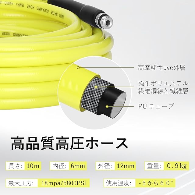 【改善②パイプをおしゃれにしてとともに高品質材料を採用】今度のケルヒャーパイプクリーニングホースは黄色いと青いパイプがあります。洗浄作業にもっと目立つになります。またケルヒャー配管洗浄ホースはPVC素材、表面は高品質ゴム、真ん中は鋼線と繊維でできた防爆層、内層はPU素材です。 圧力を落ない、ねじれにくい硬さを持ってる同時に自由に伸びる柔らかさもあります。最大18 MPaに耐える厚いポリエチレンを採用して、耐久性も強いです。また配管が詰まった時、業者を呼ばなくても自分でやれます!もっと経済的です!