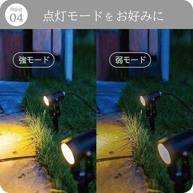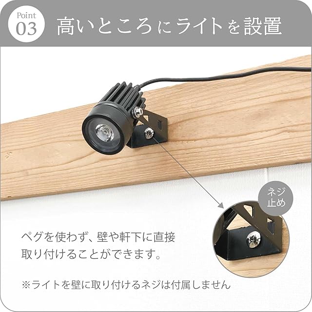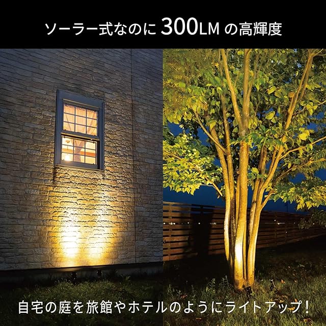 【楽しみ方はアイデア次第】 地面に設置して足元を照らす。下から庭木やフェンスを照らす。軒下や壁に設置して上から下方向を照らす。など工夫次第で色々な楽しみ方ができます。