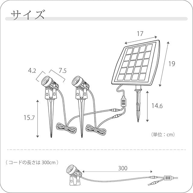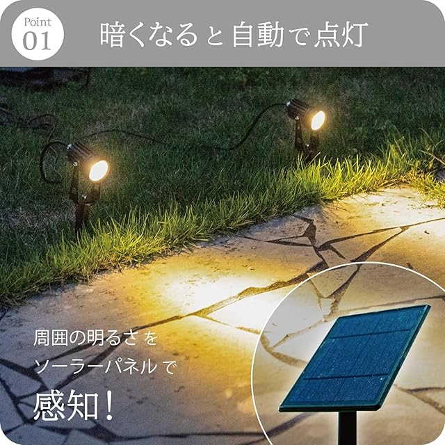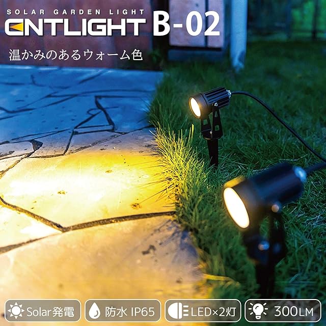 【商品の特徴】 [ENTLIGHT]B-02は、2本のコードに高輝度スポットライトが搭載されたガーデンライトです。ライトやソーラーパネルがそれぞれ独立しているため、様々な場所に設置することが可能です。