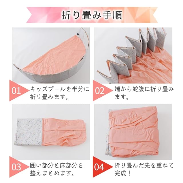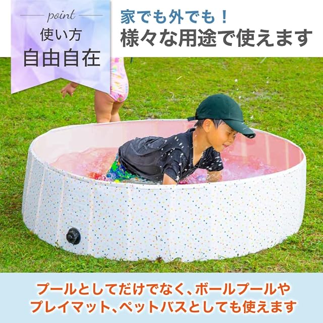 【 折りたたみプールとは 】折り畳みプールは数多く御座いますが、弊社の折りたたみプールはここが違います!1.「広げるだけで簡単に遊べる折りたたみプール」空気入れの必要がない折りたたみのプールなので、広げるだけで簡単に設置することが出来ます。 面倒な準備は必要ないので、水を入れてすぐにプールで遊べます!2.「小さく降りたためて収納に便利」折りたたみプールは小さくコンパクトに折り畳むことができるので、収納場所に困りません。持ち運びにも便利なので、いろいろな場所で遊びましょう!3.「用途もいろいろ!家でも外でも活躍してくれるプール」プールとして使う以外にも、ボールプールやペットバス、プレイマット、小物入れなどいろいろなシーンで大活躍。かわいいイルカやハートの柄なので写真でも映えます。