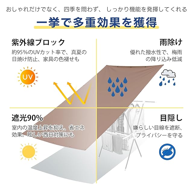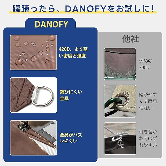【撥水加工 日除けシェード】DANOFY撥水シェードは、高品質420Dポリエステル素材を使用し、表面に2重PUコーティングを施し、優れた撥水性を誇るサンシェードです。PUコーティングは水が繊維に浸透するのを防ぎ、蓮の葉のように雨水や飛沫を効果的にはじきます。ベランダでこの日よけシェードの設置により、突然な雨に遭っても、雨避けになりベランダでの床や内容物が濡れることはなく、慌てずにノンビリとベランダのレジャータイムを楽しめます。雨がたまらないように、垂直角度を40度以上に斜めで日除けシートの設置をお勧めします。