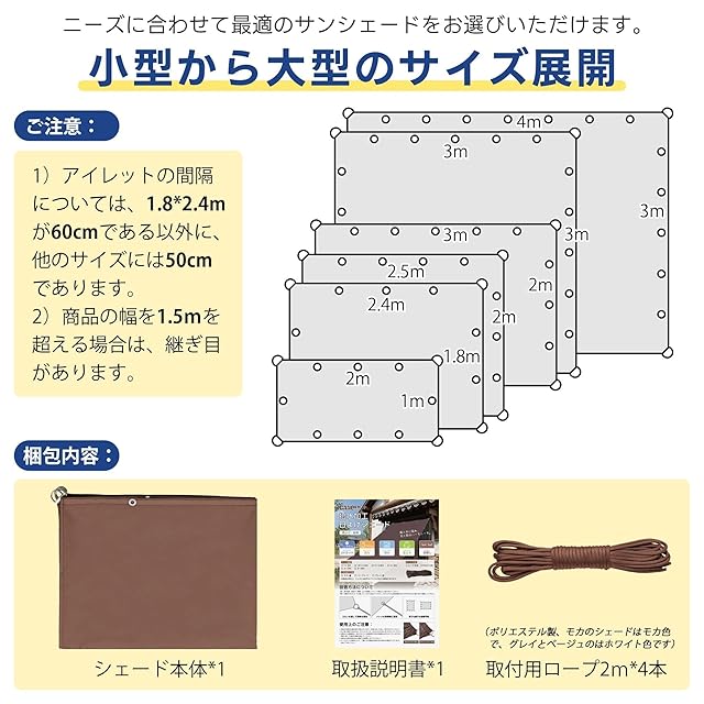 【小型から大型 シーンによりサイズ展開】小さめ1*2mから大きい3*5mまでともに6サイズ有り、おしゃれでいてインテリアとしてもベランダやバルコニー、テラスや屋根、玄関や屋上、軒下や廊下など日常生活における場所が対応可能です。また、子どもプールの日よけ、庭のタープ、アパートの目隠しシェード、カーポートのサンシェード防雨もなります。それに、キャンプ、アウトドアレジャー、野外活動も思う存分に楽しめます。もし、届いたベランダシェードに破損・汚れなど不良現象がございましたら、お気軽に弊社にご連絡ください。「お問い合わせ案内:注文履歴>出品者へ連絡>お問い合わせ内容を記入。」