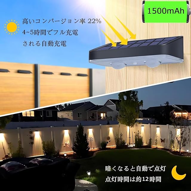 【1500mAh大容量電池】より効率の高い単結晶シリコンソーラーパネルを使用し、普通のソーラーライトより大きいから、充電スピードは速くで。さらに、大容量1500mAhバッテリーを搭載しており。特に、悪天候は点灯時間はもっと長いで。晴天時6時間充電で最長12時間点灯(※気象条件により変動)。