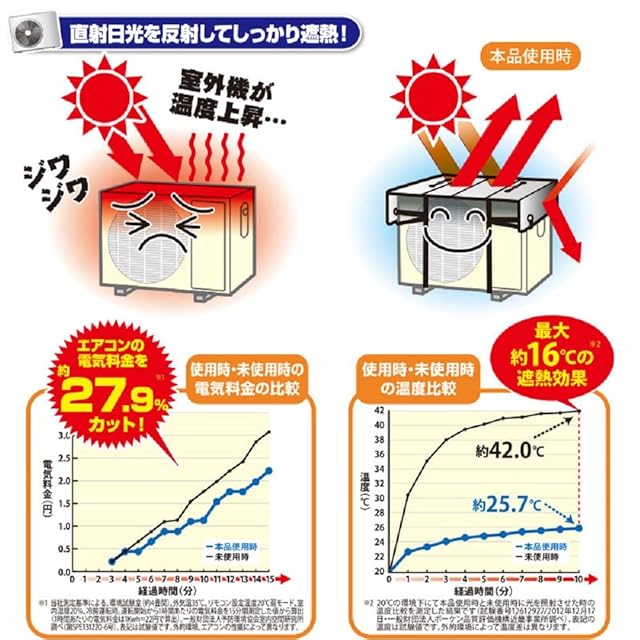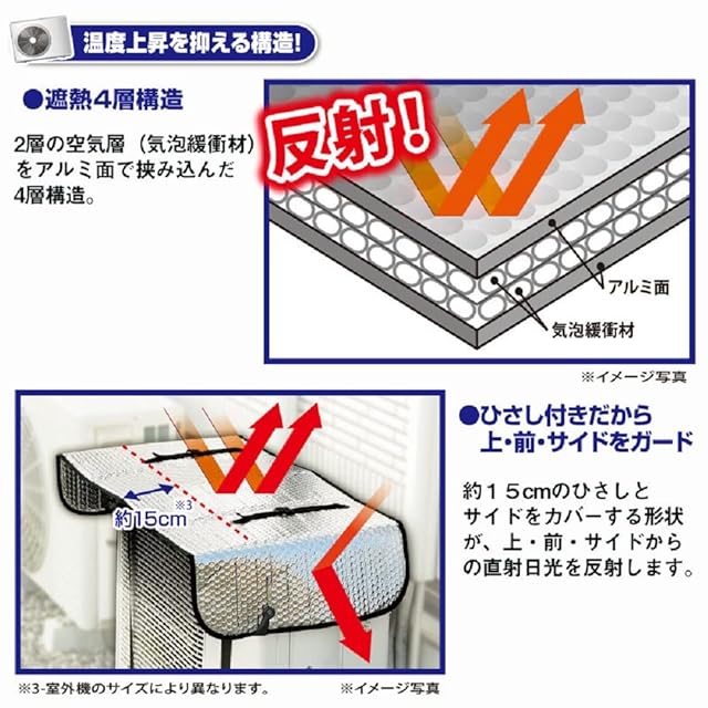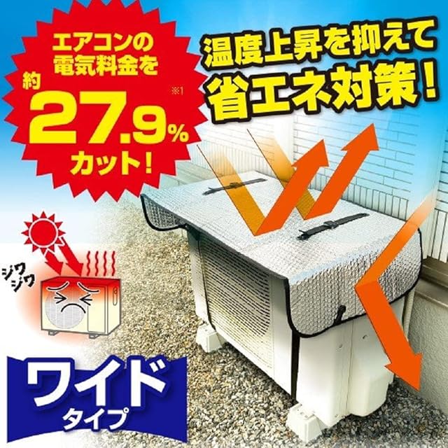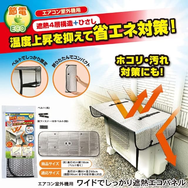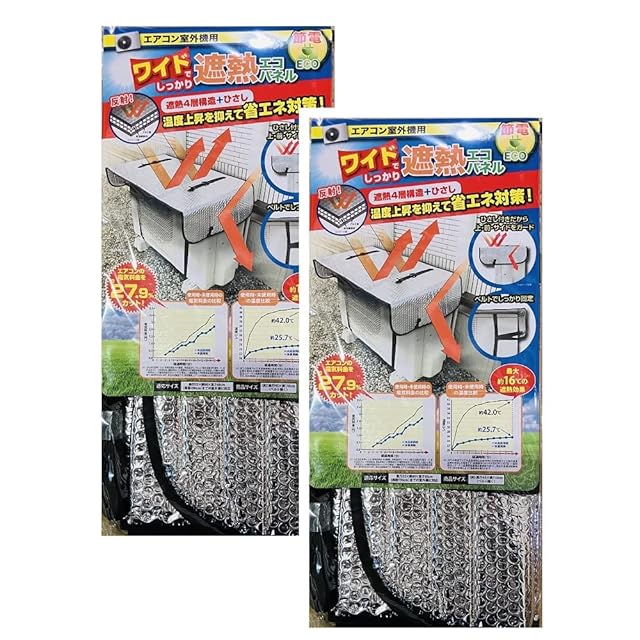 遮熱4層構造+ひさし。<br> 温度上昇を抑えて省エネ対策!<br> 『エアコン室外機用 ワイドでしっかり遮熱エコパネル 2個セット』<br> <br> ・節電、ECO<br> ・ワイドタイプ<br> <br> ■直射日光を反射してしっかり遮熱!<br> 室外機は夏場、温度が上昇すると電力を余分に消費します。<br> 本品は直射日光を反射、影を作ることで温度上昇を抑え、余計な電力消費を抑えます。<br><br> ■温度上昇を抑える構造!<br> ・遮熱4層構造<br> 2層の空気層(気泡緩衝材)をアルミ面で挟み込んだ4層構造。<br> ・ひさし付きだから上、前、サイドをガード<br> 約15cmのひさしと再度をカバーする形状が上、前、サイドからの直射日光を反射します。<br> <br> ・ベルトでしっかり固定し、ずれ落ち防止<br> ・折りたたんでコンパクト<br> ・ホコリ、汚れ対策にも!<br> <br> ■商品サイズ<br> (約)奥行45×横110cm<br> <br> ■適応サイズ<br> 奥行35×横80×高さ60cm (周囲190cm)までの室外機に対応<br> <br>