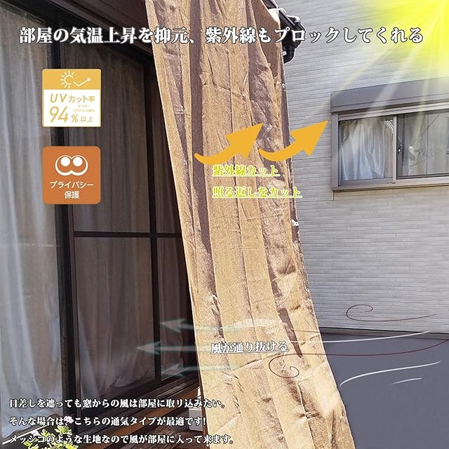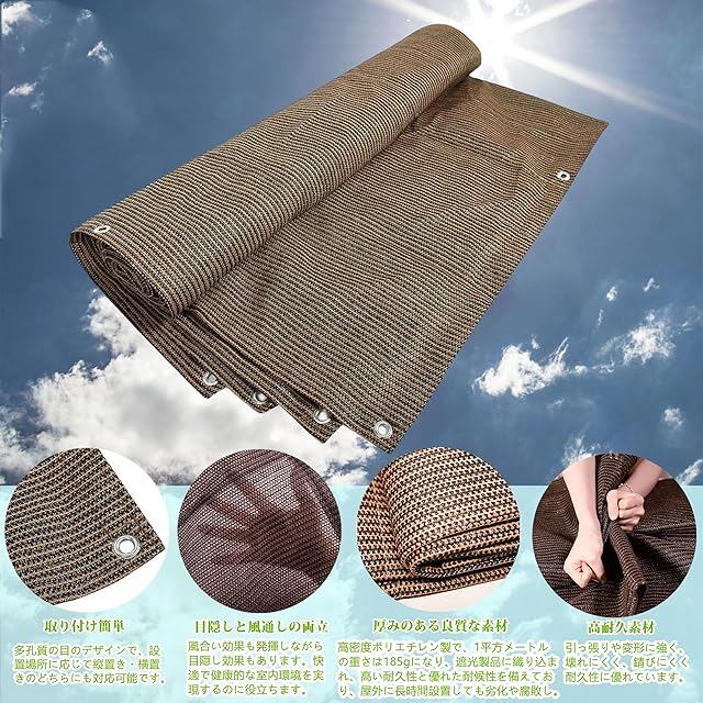 【簡単な取り付け】多孔質の目のデザインで、四辺に十分な数のハトメ穴があります。強い生地で遮蔽性も優れており、白い紐が付属しています。取り付けは簡単で、汚れても水洗いできるため、手入れが簡便です。自然な形状記憶加工により、折りたたみ時のシワも自然に戻ります。シーズンオフにはコンパクトに折りたたんで収納できます。