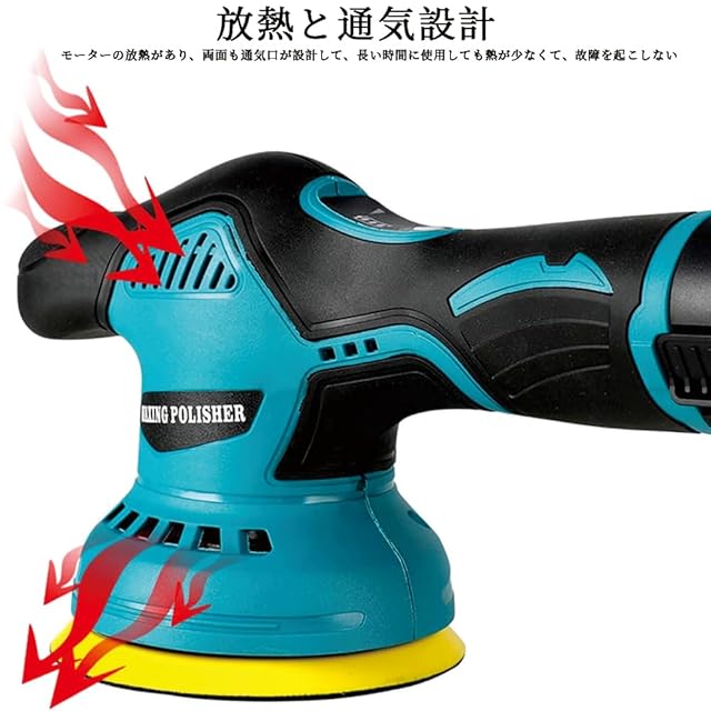 【ダブルアクション方式・放熱と通気設計】回転方式がダブルアクションなのでシングルアクションより研磨力は劣るものの、洗車キズや水垢を落とすのには十分な研磨力があります。モーターの放熱があり、両面も通気口が設計して、長い時間に使用しても熱が少なくて、故障を起こしません。