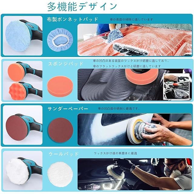 【セット内容・安心な対応】当社のポリッシャー ダブルアクションは市場の要求を考慮し、一般的に利用される構成や組み合わせが含まれています。商品内容:ポリッシャー本体 *1、大容量バッテリー *2、充電器 *1、ウェーブスポンジ *2、平面スポンジ *2、サンドペーパー *5、ウールパッド*2、繊維カバー*4、ウールボール*2、取扱説明書*1 。ポリッシャーはブランド品質で1年間があります、期間に商品何か問題が発生した場合は、弊社までお気軽にお問い合わせください、問題を解決できるよう最善を尽くします。