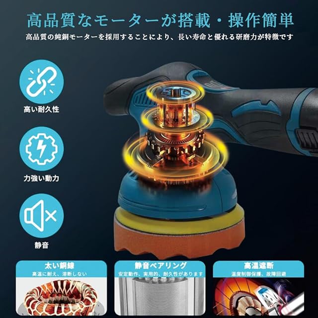 【高品質なモーターが搭載・操作簡単】当ポリッシャーは高品質の純銅モーターを採用することにより、長い寿命と優れる研磨力が特徴です。ポリッシャー本体はわずか1.2kgの軽量タイプで、片手での操作が楽になります。安定感と操作性のバランスが良好になっています。かつ、ダブルアクションタイプは車へのダメージが少なく失敗のリスクが低いことが魅力です。当ポリッシャー 充電式は移動便利さと性能を兼ね備えて初心者でも簡単に使えます。