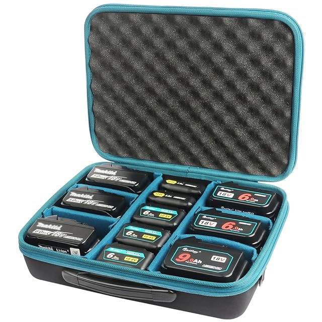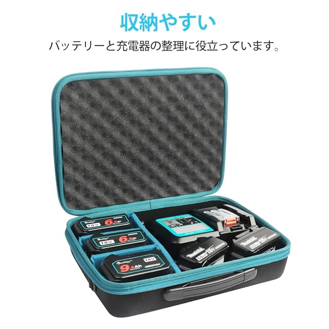 Makita バッテリー 互換品など収納ケース 外部サイズ:36×26×9cm 重量:760g 素材:EVA この収納ケースは、Makitaバッテリー、互換品を安全に収納できます。耐久性があり、衝撃に強く、長持ちするEVA素材が使用されているため、ハードな使用にも耐えることができます。収納スペースが広く、複数のバッテリーを収納できるので、使用時に手間がかかることなく、スムーズに作業を進めることができます。また、外部にはハンドルが付いているため、持ち運びも簡単です。