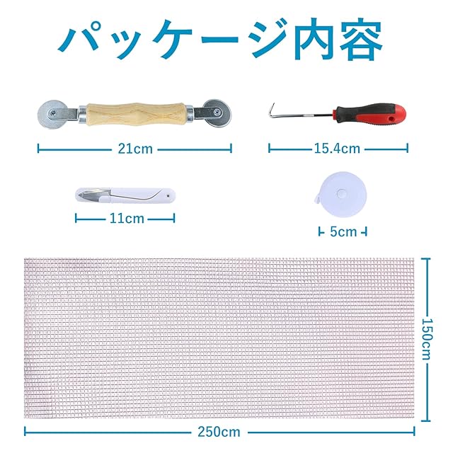 【5点セット内容・簡単設置】網戸ネット(150×250cm)、ハサミ、ローラー、押さえバー用フック、巻き尺の5点セットが付属。専用工具が全て揃っているので、届いたその日からすぐに施工可能!DIY初心者でもカンタンに取り付けられます。