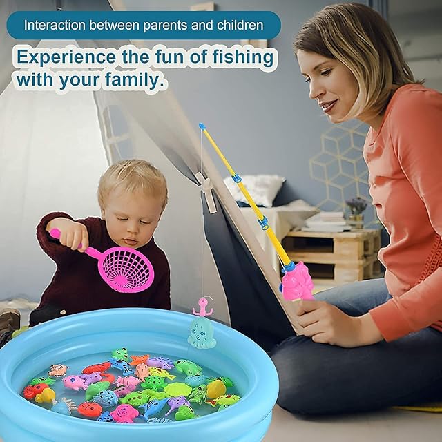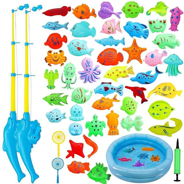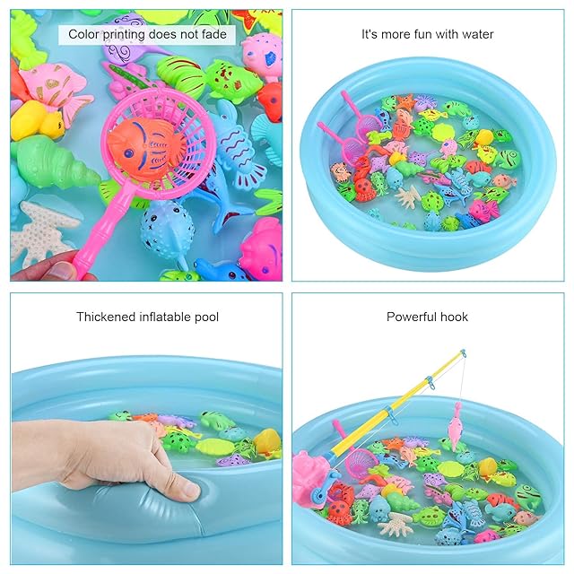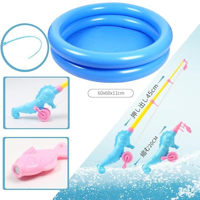 【豪華な50個セット】インフレータブルプール*1個、ランダムなつり竿*2、ランダムな色大きな漁網*2個、ランダムな立体魚*44個、空気ポンプ*1個、高品質のプラスチックと磁性材料で作られている、無毒で無味です。