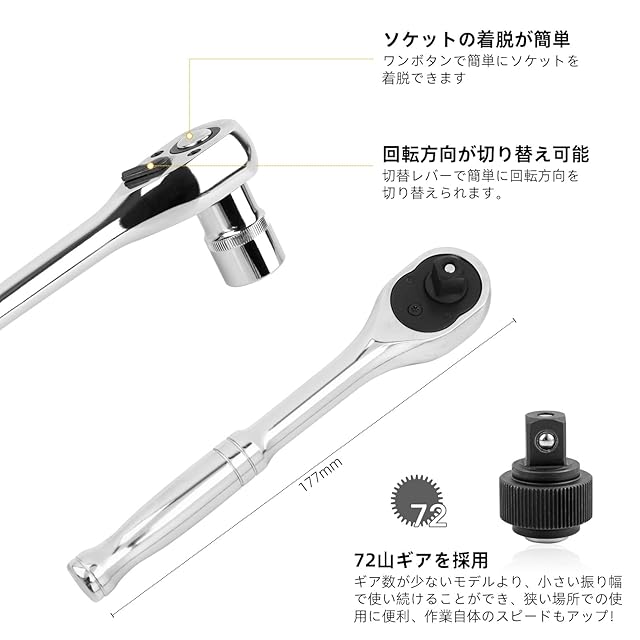 人間工学デザイン:ラチェットハンドル:177mm長さを実現、72山を採用。ソケット:表面にローレット加工で、内部に固定穴を設けて、耐摩耗性を増加し、空回りすることを避けます.