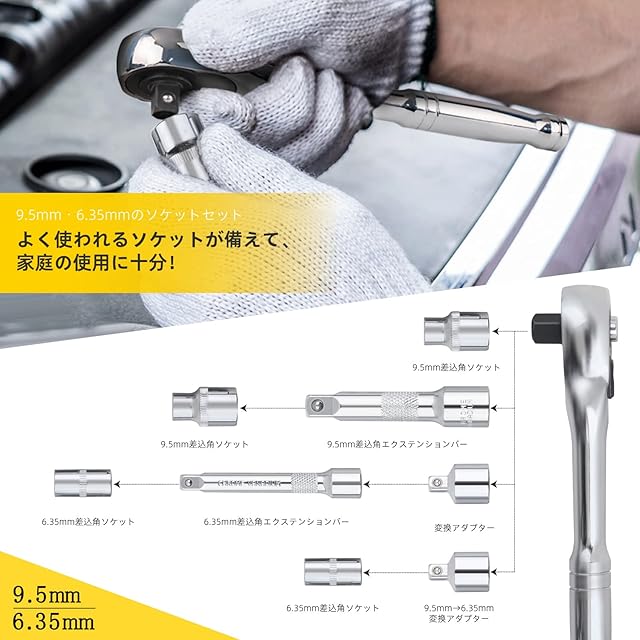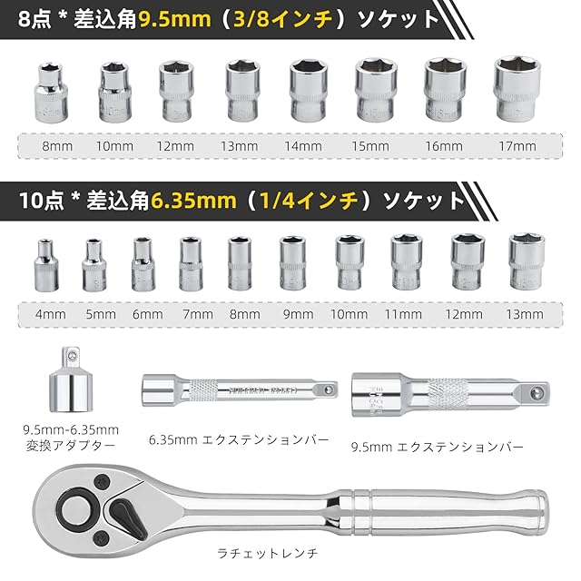 セット内容:9.5mm角ラチェットハンドル、ソケット9.5mm角:8・10・12・13・14・15・16・17mm、ソケット6.35mm角:4・5・6・7・8・9・10・11・12・13mm 、エクステンションバー9.5mm角、エクステンションバー6.35mm角、ソケットアダプター9.5mm×6.35mm