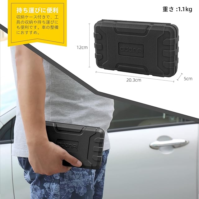 持ち運び便利:収納ケース付きで、コンパクトで軽量(サイズ:20.3*12*5cm、重さ:1.1kg)、車載工具として使えます。