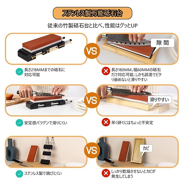 【初心者プロ向き】:この研ぎ石は、角度固定用刀補助具付きのでプロはもちろん、初心者の方でも簡単に使いこなせる。または、万能砥石台つきので、従来のゴムの滑り止めと比べ、研いでいる最中に包丁が手元からずれて大事故になるのを防げます。とても安心てきます。