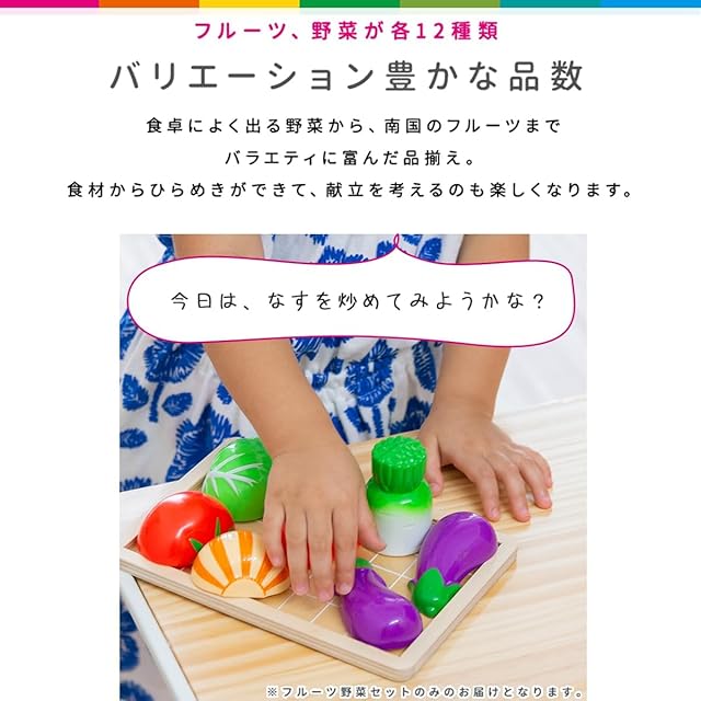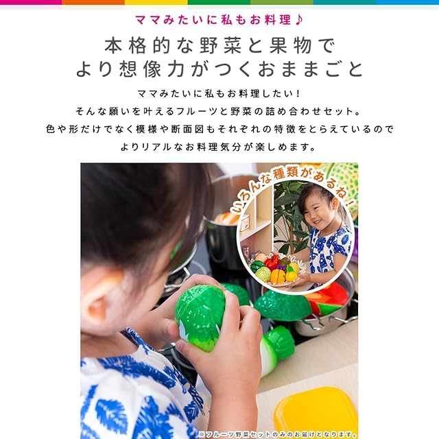 【ママみたいに私もお料理したい! 】 そんな願いを叶えるフルーツと野菜の詰め合わせセット。 色や形だけでなく模様や断面図もそれぞれの特徴をとらえているので よりリアルなお料理気分が楽しめます。
