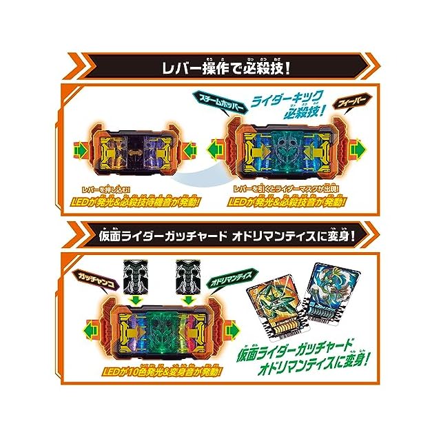付属するライドケミートレカで「仮面ライダーガッチャード スチームホッパー」「仮面ライダーガッチャード オドリマンティス」への変身なりきり遊びが楽しめます。