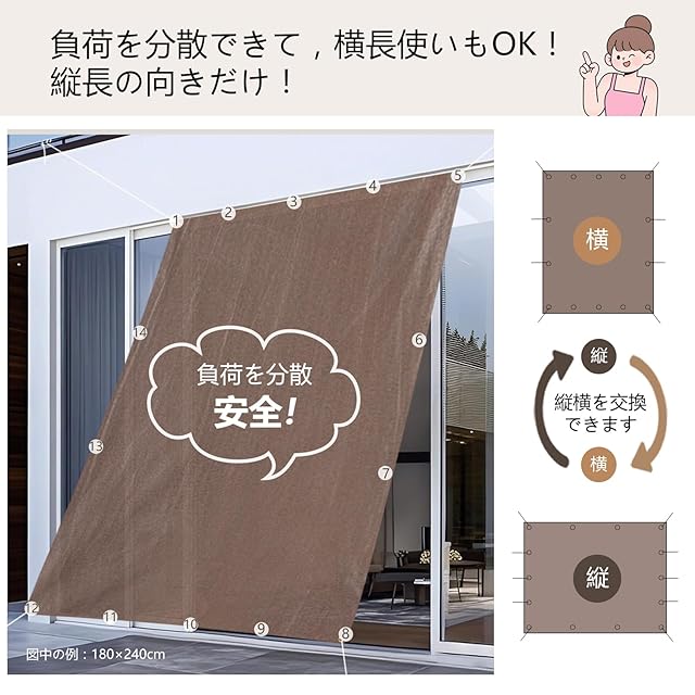 取り付け:錆びないのゴールデンアルミハトメが付いているので、付属品:6本x1.5m取付けひも、ベランダや窓ペ、廊下、庭下、庭先、玄関などに簡単に取り付けることができます。お洒落なデザインなので、日よけだけでなく、ご自宅やお庭のエクステリアとしてもご利用なれます。