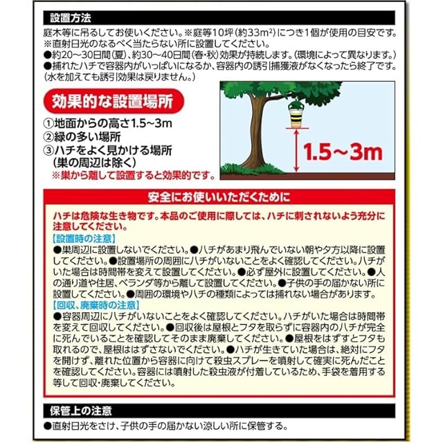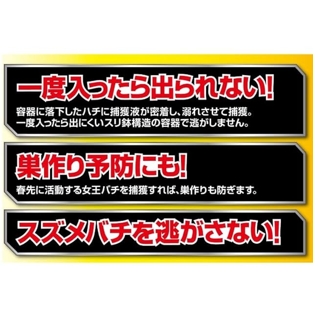 ハチを溺れさせる捕獲液により一度は入ると逃げられないので安心です。